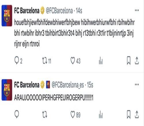 阿劳霍绝杀后,巴萨官方社媒激动到胡言乱语 雷速体育 2025-10-19 04:00:54 雷速体育10月19日报道宣称 西甲第9轮,巴萨凭借阿劳霍伤停补时的绝杀,主场2-1力克赫罗纳。在阿劳霍破门后,巴萨官方社媒也激动到胡言乱语,接连发布了两条不明所以的长串英文字符,以表达球队的激动之情。 西甲 巴萨 巴塞罗那队 欧洲杯揭幕战 罗纳德·阿劳霍 上一篇: 巴萨本轮西甲名单:亚马尔、费尔明伤愈归队复出在即 下一篇: 西甲前瞻巴萨30赫罗纳:国家队比赛,让巴萨损兵折将