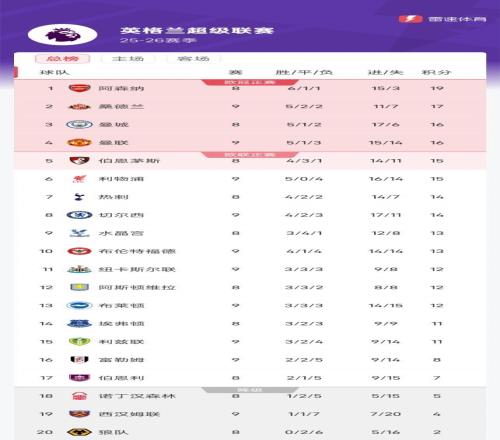 雷速体育10月26日报道宣称 截至北京时间今日凌晨,25/26赛季英超联赛第9抡结束了5场比赛的争夺,球队的积分排名也相应出现了变化。
