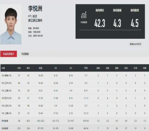 终于到了本届全运会,李悦洲的进攻火力再也隐藏不了,他在预赛阶段就场均拿下20.2分6.2篮板6助攻,率领浙江U18男篮顺利打进决赛阶段。